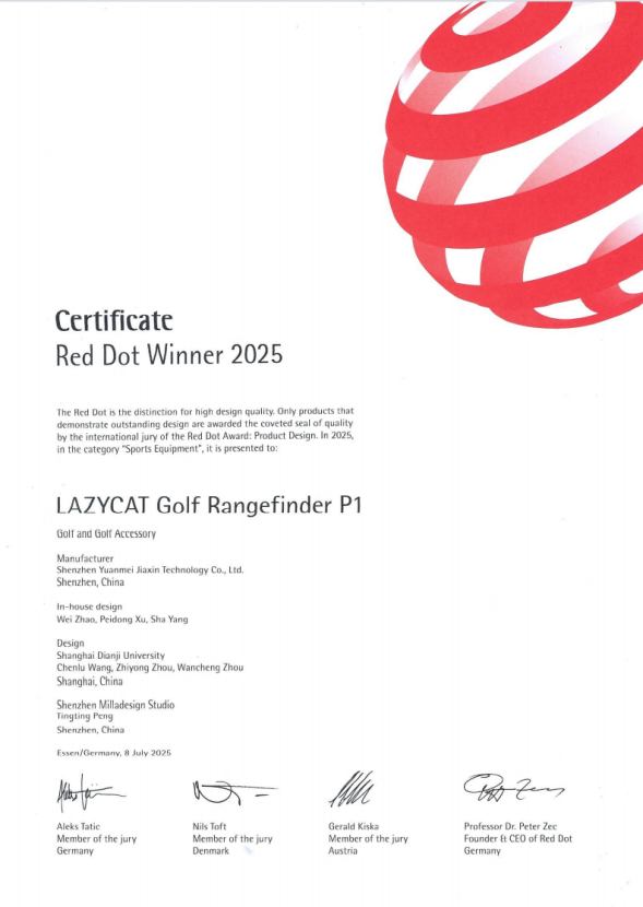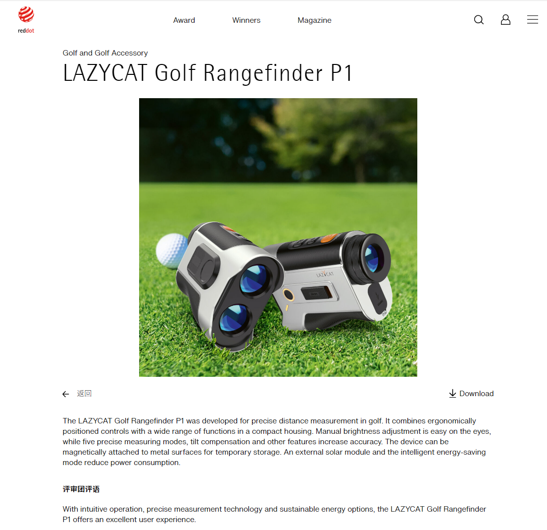 此外,由王陈璐博士参与的“LAZYCAT高尔夫测距仪P1”项目也同期获得了红点产品设计奖。该产品专为高尔夫运动中的精确测距需求设计,融合了人体工程学控制面板与多种实用功能,具备手动亮度调节、多种测量模式及节能特性,适用于高尔夫运动场景。