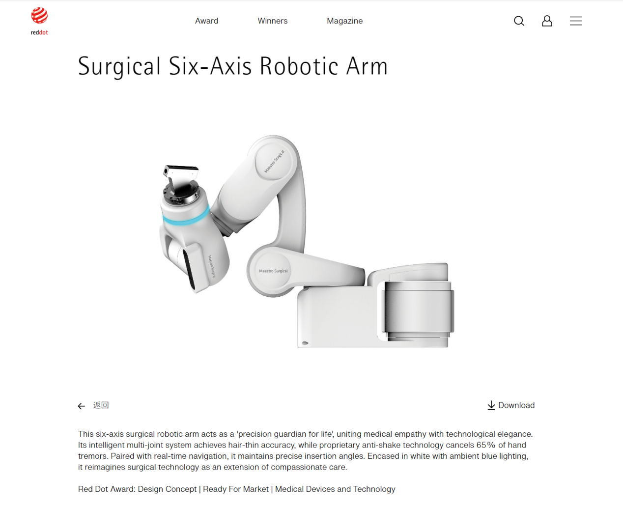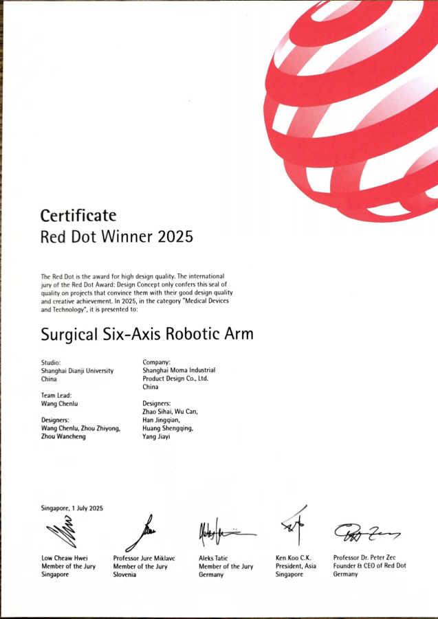 近日,我校设计与艺术学院新引进教师王陈璐博士凭借其主持设计的“六轴手术机器人手臂(SurgicalSix-Axis Robotic Arm)”作品,荣获2025年德国红点产品设计大奖,这是我校首次获得这一国际顶级设计奖项。同时,王陈璐博士参与设计的“LAZYCAT高尔夫测距仪P1(LAZYCAT Golf Rangefinder P1)”也同期获奖。这两项成果标志着我校在跨学科创新设计与科技融合领域取得重要突破。